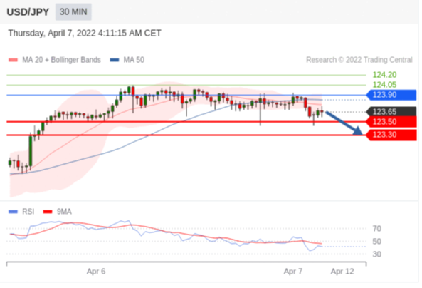 在 123.90 之下,看跌,目标价位为 123.50 ,然后为 123.30 。