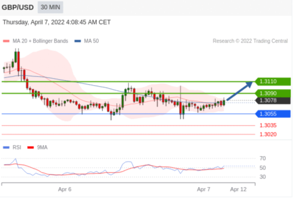 在 1.3055 之上,看涨,目标价位为 1.3090 ,然后为 1.3110 。