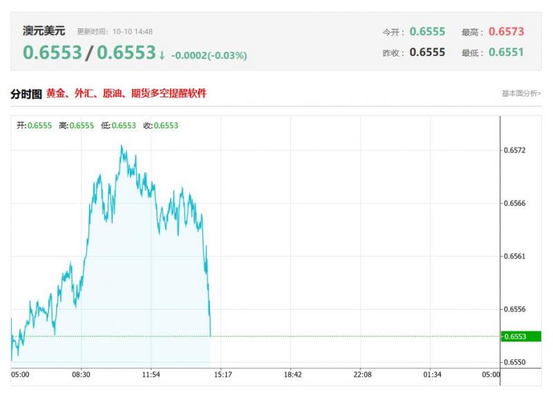 周五盘中,澳元/美元报0.6565, 跌幅0.03%.