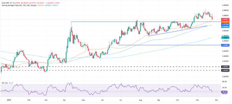 在4小时图上,欧元/英镑交易于0.8715,距离两个月低点0.8707不远。 技术指标表现混合。 相对强弱指数(RSI)位于41,未能回升至关键的50水平,而移动平均趋同/背离(MACD)略微转为正值,但似乎无法脱离信号线,并显示出接近平坦的直方图,暗示动能有限。