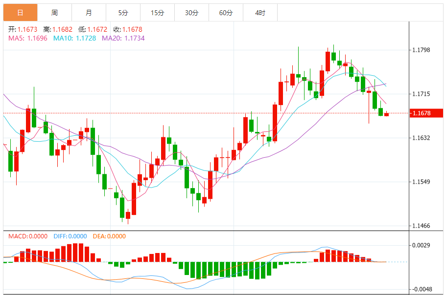 周四,欧元/美元徘徊于1.1680下方,现交投于1.1678附近,涨幅0.04%。