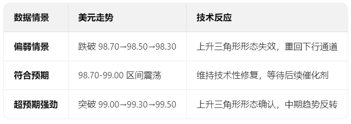 形态分析:形成"上升三角形"形态,颈线位99.00,突破后有望测试99.50→100.00,若失守则可能回落至98.30→98.00