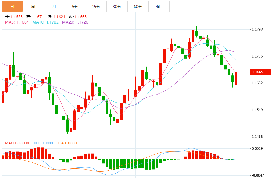 周一,欧元/美元徘徊于1.1667下方,现交投于1.1665附近,涨幅0.25%。