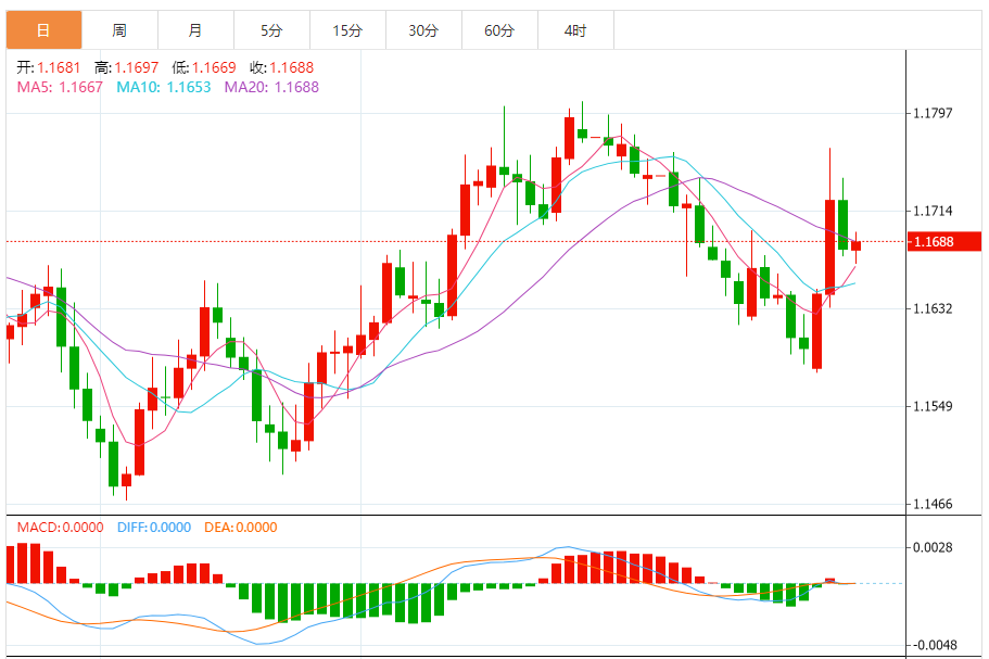 周四,欧元/美元徘徊于1.1690下方,现交投于1.1688附近,涨幅0.05%。