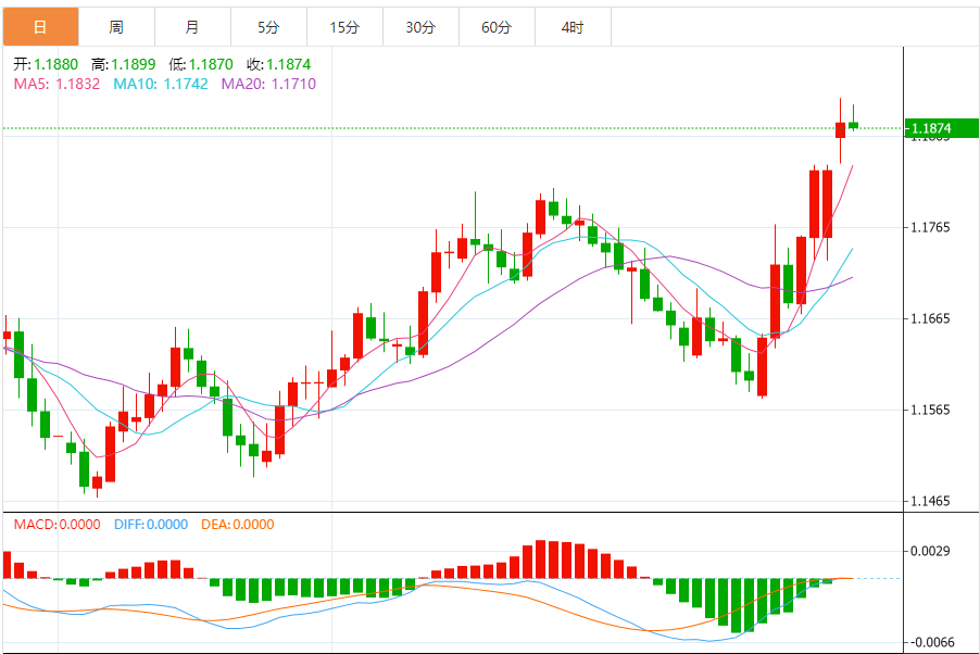 周二,欧元/美元徘徊于1.1876下方,现交投于1.1875附近,跌幅0.03%。