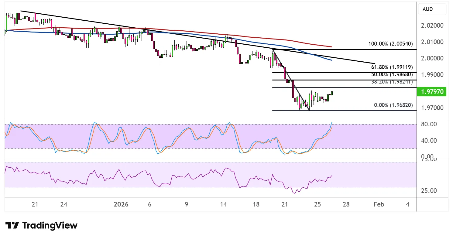 斐波那契回撤工具凸显了潜在阻力区块,空头动能可能恢复。38.2%的Fib位于1.9824,50%的水平位于1.9868。这两个区间与自图表早期以来一直引导货币对下跌的趋势线阻力高度一致。