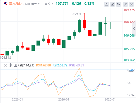 日线图中,澳元/日元稳居上升的20日均线和100日均线上方,凸显了根深蒂固的多头趋势。两者均值均向上倾斜,确认了上行偏向并提供动态支撑。RSI在63.64,在较前过买读数回落后仍处于正区间,显示出强劲但温和的动能。即时阻力位于布林带上游108.35,第一支撑位于106.45的中线。日收盘若在阻力位上方,可能延续涨幅,而在此暂缓收盘则有利于回调至中段。