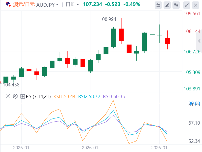 日线图中,澳元兑日元保持在上升的100日均线上方,维持了中期的上涨趋势。回调至该平均线将检验趋势支撑。现货价格在布林带下方104.37下方交易,随着布林带的扩张,显示波动性升高且下行空间拉长。RSI位于41.21,跌破50大关,确认动能减弱。反弹可能延伸至中线106.48,而持续压力则可能再次测试100日均线102.95。
