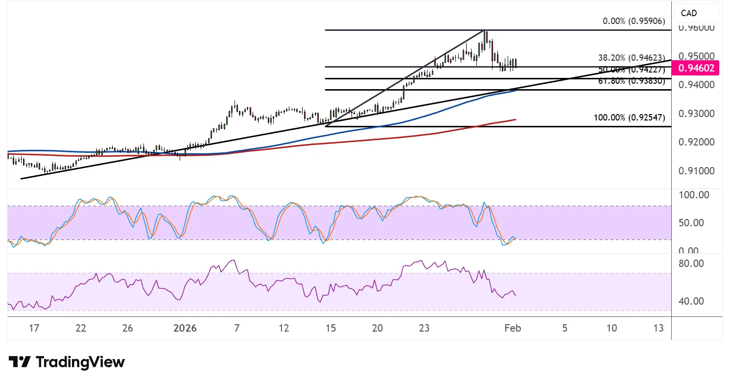 价格徘徊在0.9460附近,已从一月底创立的高点回落。斐波那契回撤工具凸显了多头动能可能回归的关键支撑区。