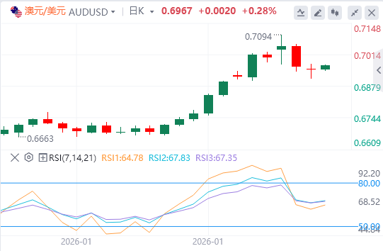 上行阻力:若RBA释放鹰派信号,澳元可能反转并测试0.7050心理关口,后续阻力依次看向2026年高点0.7094、2023年2月高点0.7158;