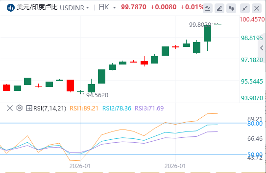日线图中,美元/印度卢比报90.5715。价格守在20日指数移动平均线91.0466以下,该线下坡并限制了反弹尝试。平均线的下跌使短期趋势持续下沉。RSI位于44.82(中性)跌破中线,确认上行动能减弱。