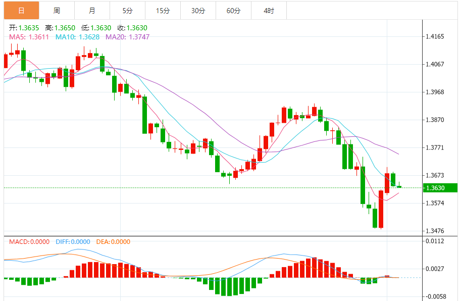 周三,美元/加元徘徊于1.3632下方,现交投于1.3630附近,跌幅0.04%。