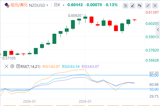 日线图显示,纽元/美元已完成广泛的基础构建过程。该货币对在2025年10月底触底至0.5580后,目前价格已攀升至0.6053,且同时高于50指数移动平均线(EMA)0.5867和200指数均线0.5849。