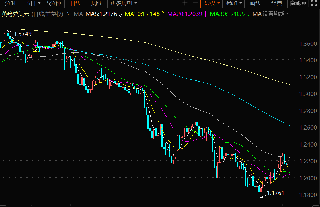 另外若汇价出现反弹,上行目标是处在50SMA水平的水平 1.2150,然后是前期支撑线1.2170。即使英镑/美元突破1.2170 关口,6月16日以来的下降倾向阻力(1.2285附近)也可能成为多头目标。