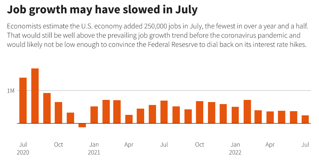 经济分析师预期7月美国仅新增25万个就业岗位,为逾一年半以来最小增幅,但还是远远高于疫情前就业增长的主要趋势,很可能因为不够低,无法说服美联储扭转升息政策。