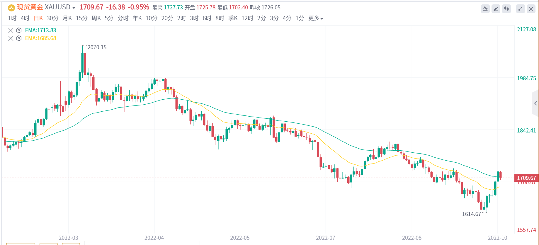 10月4日公布的美国劳工部的职位空缺和劳动力流动调查公布的数据显示,美国8月份职位空缺降幅超过预期,从7月的1120万减少至8月的1010万,降至2021年6月以来的低点,这表明美国劳动力需求尽管仍然强劲,但正在放缓。报告发布后,黄金价格再次拉涨,因为该项数据令交易员们乐观地认为,鉴于劳动力市场正在降温的一些迹象,美联储可能不必如此激进地加息。