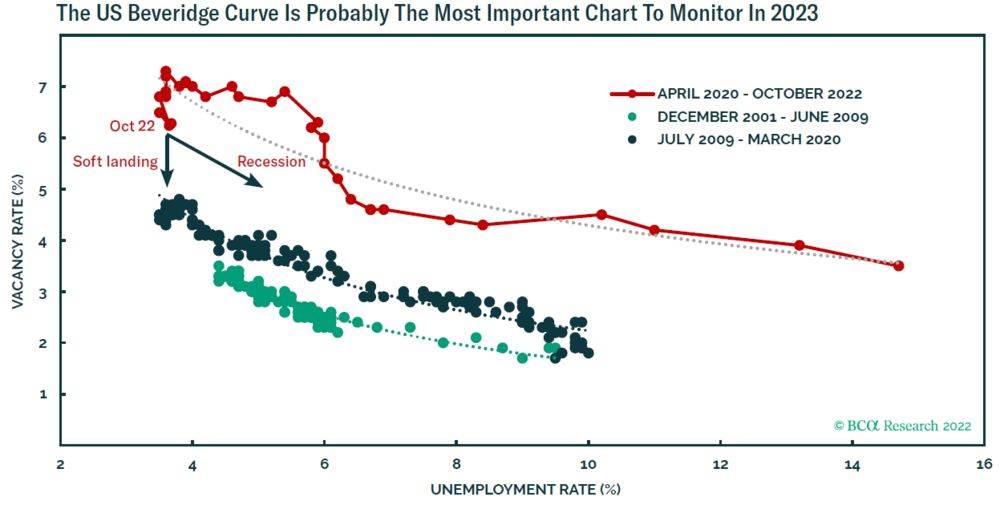 对美联储而言,它希望通过收紧货币政策,可以降低企业对劳动力的需求,但这并不仅仅意味着更高的失业率,而是贝弗里奇曲线回到更正常的区间,从而使经济实现“软着陆”。然而,另一种可能是,技能不匹配仍然严重,以至于企业只能通过削减总用工数来降低工资要求,从而削弱劳动力的议价能力。换句话说,通过导致经济衰退来缓解劳动力紧张。因此,2023年,贝弗里奇曲线可能是最值得交易者关注的曲线。