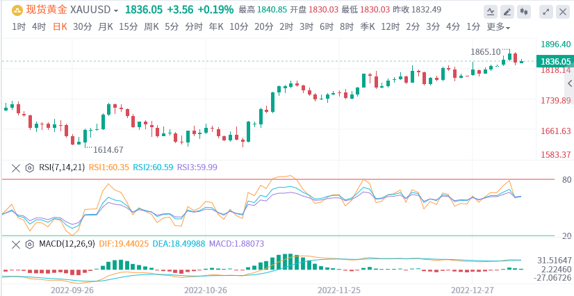 继前一日下跌1.2%之后,金价在周五早些时候轻微上涨并交投于受限区间内,交易员等待美国就业数据。金价从1865美元(1月4日的峰值,近7个月最高水平)回落,此前美国的意外数据(私营部门招聘人数远超预期,每周申请失业救济金人数降至数月低点)表明,美联储将在紧缩道路上停留的时间比预期更长,这提振了美元。投资者寻找美国就业数据的进一步信号,若数据高于预期,这可能进一步提升美元并给金价带来压力。一系列的日线移动平均线和1800美元的心理水平在1821/1796美元区域提供了支持,如果跌破该位,将削弱近期结构,并有进一步下跌风险。