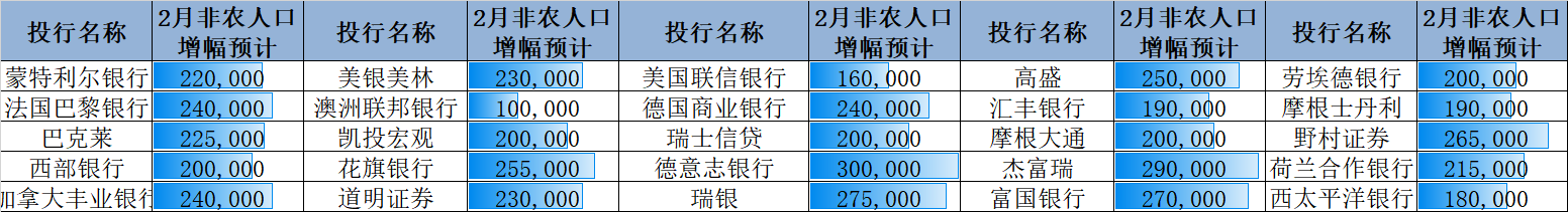 各大机构预期今晚21:30公布的美国2月季调后非农就业人数