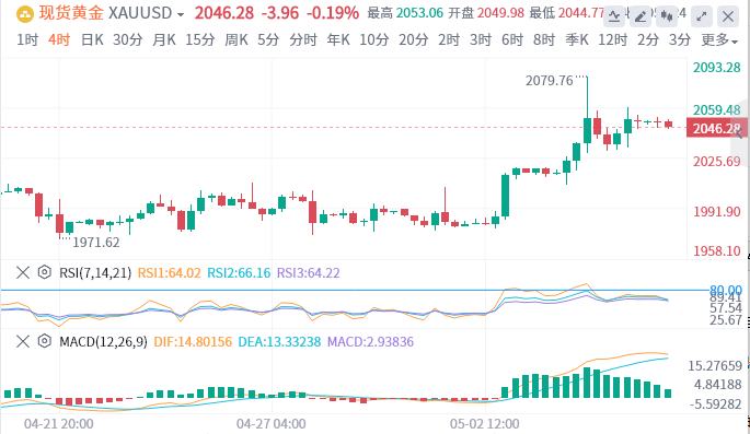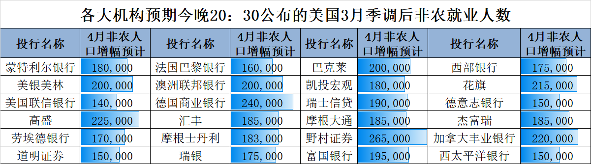和前值相比,投行认为4月非农增速下滑,相比之下失业率和平均时薪年率和前值相差不大。若数据显示4月非农增幅真如投行预测那样下滑,黄金有望获得提振后继续上行。