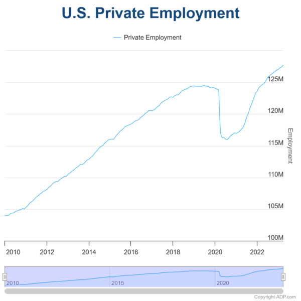 尽管美联储已经一直在采取措施减缓经济增长,尤其是抑制强劲的就业市场,但就业人数仍大幅上升。根据ADP的统计,美国就业市场今年增加了超过80万个就业岗位。就业市场供求失衡造成了强劲的工资增长,这反映在了持续的通胀压力上。