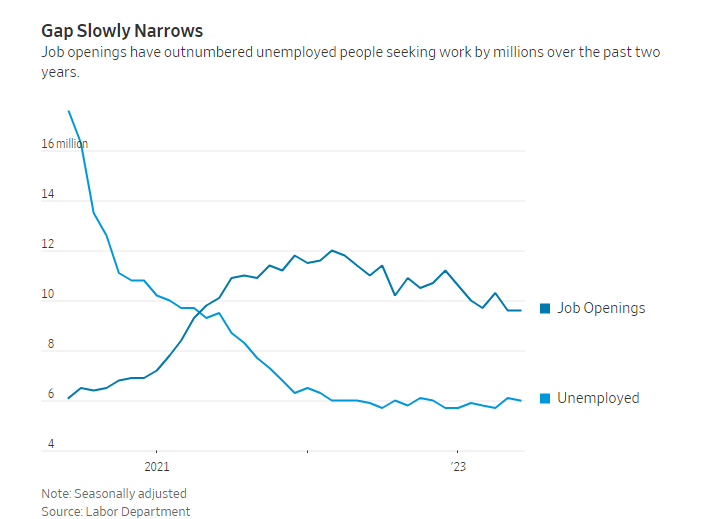 职位空缺从2022年3月创纪录的1200万个下降,但仍远高于疫情前的水平,超过了6月份600万名求职者人数。