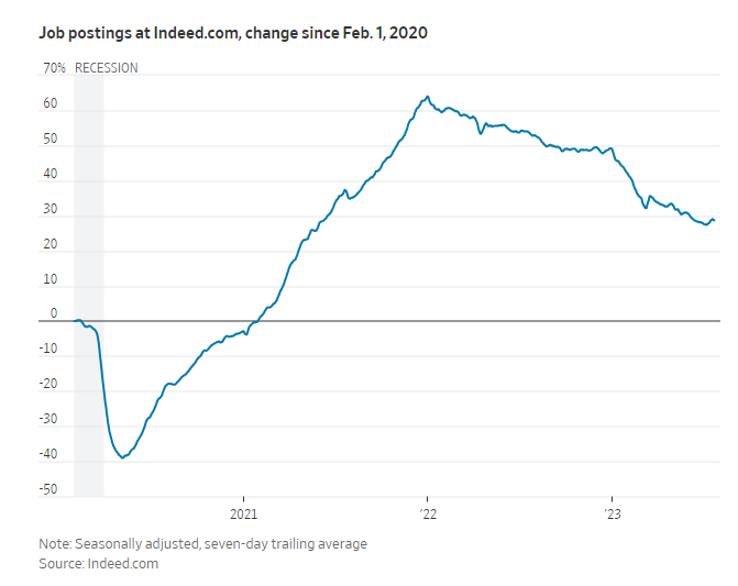 Indeed最近公布的私营部门数据也显示,劳动力需求正在稳步放缓。7月中旬,招聘网站上的职位总数比去年同期下降了16%,但仍高于疫情前的水平。