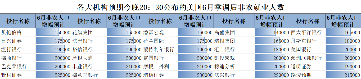 从总体来看,市场对6月份19万的就业增长预测,不仅低于5月份的27.2万,还低于24.9万的3个月平均值、25.5万的6个月平均值和23万的12个月平均值。而华尔街的预测范围从RBCCapitalMarkets预测的23.7万到高盛预测的14万。