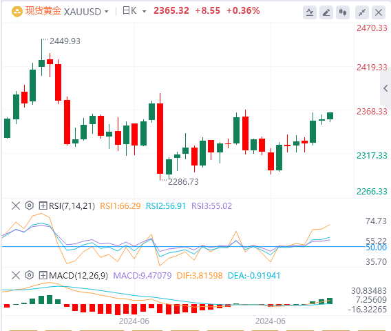 从技术面来看,金价的短期技术前景基本保持不变,黄金在周三收于关键的50日均线上方,突破本周的盘整趋势,此后风险便偏向上行。一份疲软的就业报告可能使黄金多头重获突破动力,推动金价上涨至2400美元的门槛,但在此之前首先需要攻克2369美元的前两周高点和2389美元的6月份高点。目前黄金的14天相对强弱指数(RSI)在50水平之上,增加了其看涨潜力的可信度。