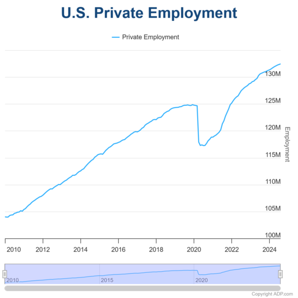 ADP报告指出,美国8月份劳动力市场继续降温。私营部门就业增长连续第五个月放缓,同时工资增长保持稳定,未离职者为4.8%,跳槽者为7.3%。