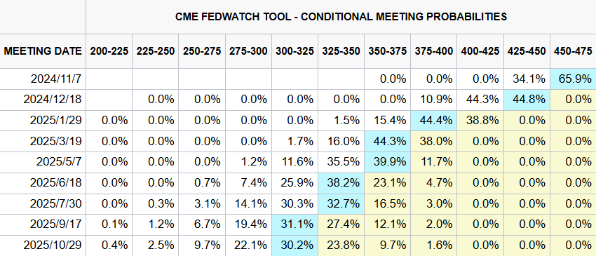 同时,本周初美联储主席鲍威尔也明确表示,无需急于行动,今年将再降息两次,总幅度达到50个基点。换句话说,接下来的两次会议(11月和12月)将分别降息25个基点。尽管如此,市场仍未完全放弃押注降息50个基点的可能。目前利率市场显示,11月降息25个基点的可能性为65.9%,降息50个基点则为34.1%,而12月降息50个基点的可能性则为44.3%。