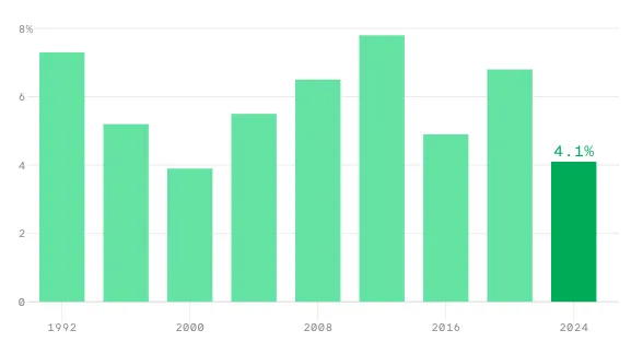 宾夕法尼亚州可以说是选举人团之战中最重要的“奖品”,因为选举人票数在7个摇摆州中最多,为19票。虽然该州失业率与2023年9月的数据相比上升了1个百分点,但其最新数据仅为3.4%,且已经连续两年低于4%。