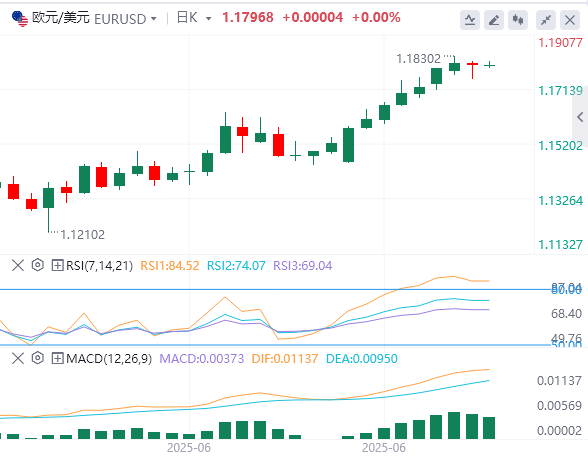 由于14天相对强弱指数(RSI)徘徊在日线图上70水平上方的超买区域,主要货币对有可能回调至21天简单移动平均线(SMA)支撑位1.1568。
