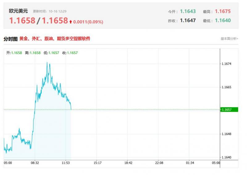 截至目前,欧元/美元上涨0.09%,报1.1658。