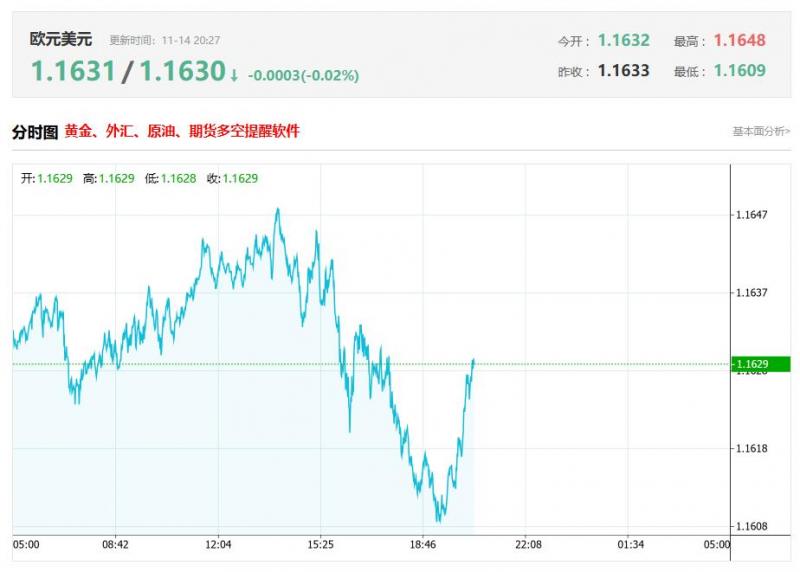 截至目前,欧元/美元下跌0.02%,报1.1630。