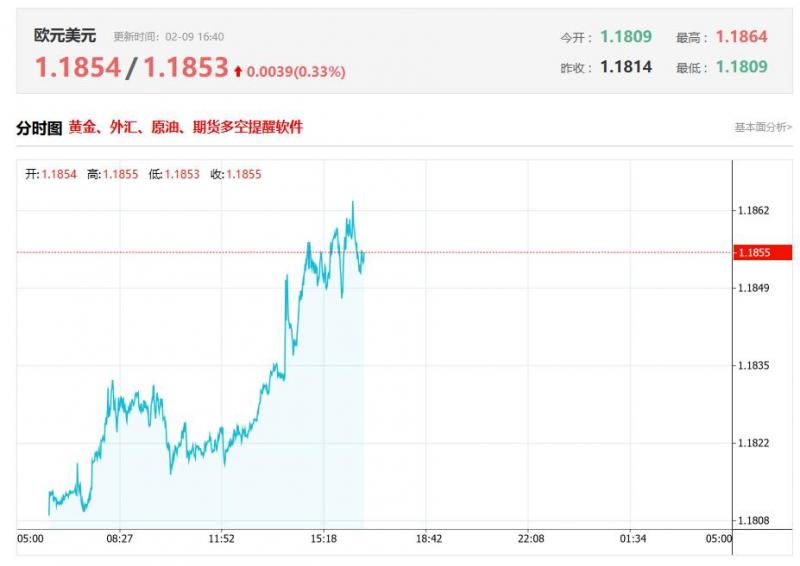 截至目前,欧元/美元上涨0.33%,报1.1853。