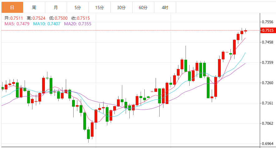如要展开更大上行空间,多头需要突破周四高点0.7528,使得澳元/美元接近 2021 年10 月28 日高点0.7557。若汇价突破该水平将测试61.8% 斐波回档位 0.7613。另一方面,如果汇价跌破周三低点0.7450,多头可能会失去主导。汇价将依次测试分别处在38.2% 斐波回档位和200 EMA的0.7369和0.7300。