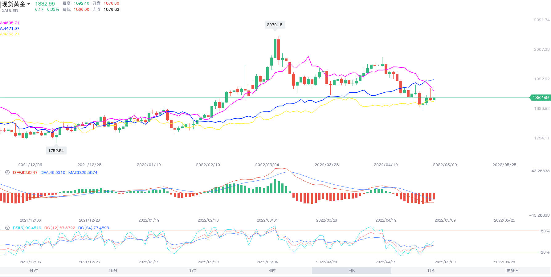 上周五现货黄金震荡收高,盘中一度站上1890美元/盎司,尾盘有所回落,最终收涨0.48%,报1883.4美元/盎司;现货白银一字横盘,最终收跌0.42%,报22.36美元/盎司。
