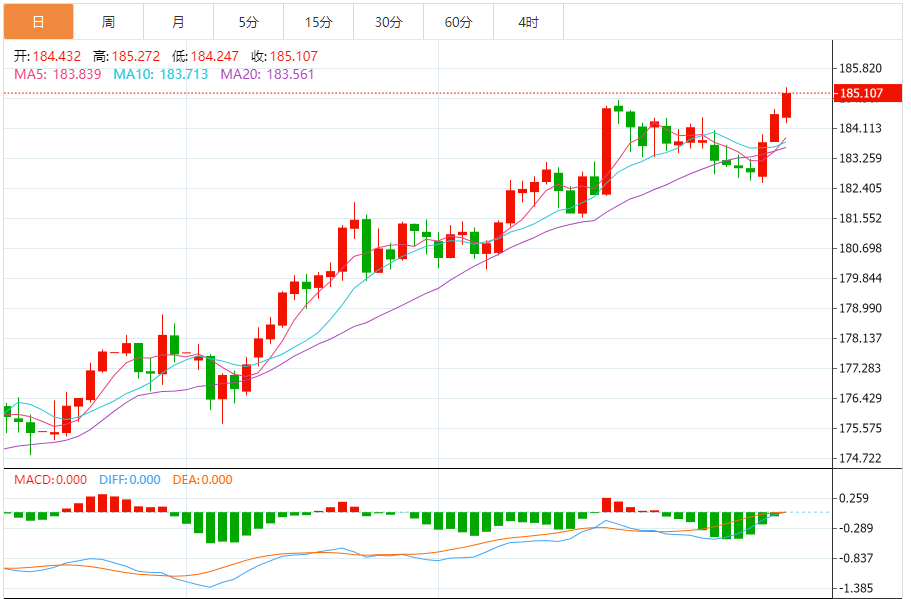 周二,欧元/日元上涨0.32%至185.142附近。