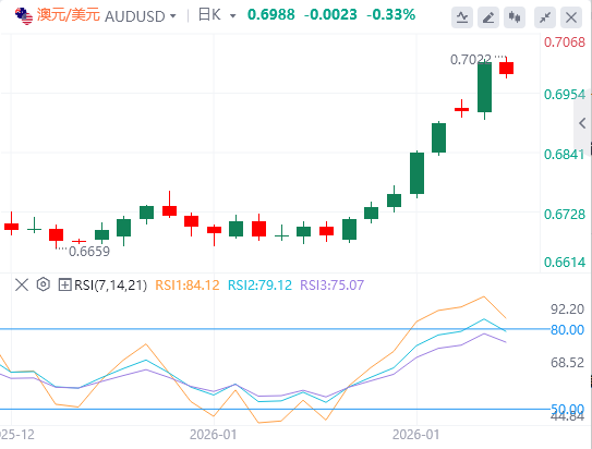 澳元/美元日线图分析显示该货币对在上升通道形态内上涨,显示持续多头偏向。14天相对强弱指数(RSI)位于80.27,显示超买,表明动能被拉长。