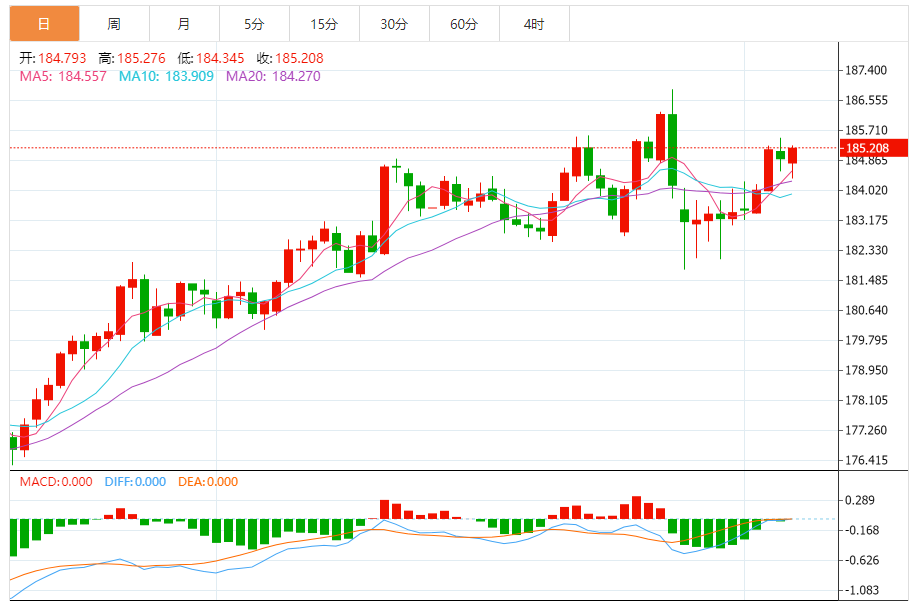 今天的预期交易范围:在183.85和185.40之间