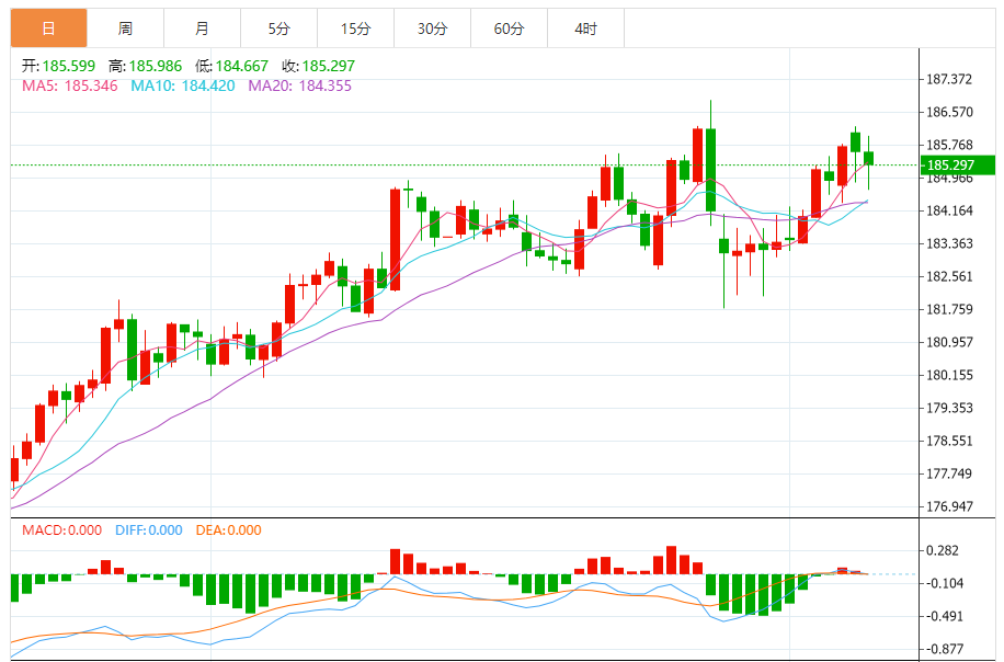 周二,欧元/日元下跌0.18%至185.313附近。
