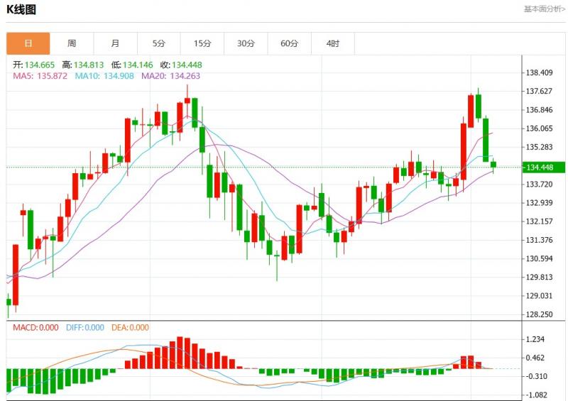 周四盘中,欧元兑美元报1.1050,跌幅0.03%;英镑兑美元报1.2571,涨幅0.22%;美元兑日元报134.463,跌幅0.17%。