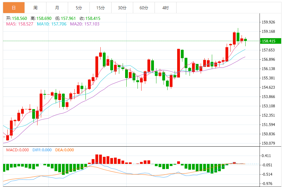 周五(1月16日),美元/日元下跌158.444,暂报158.415,跌幅0.11%。