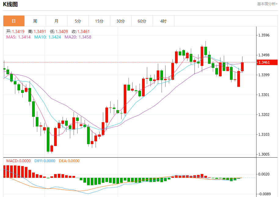 汇价高见1.3491,低见1.3409。上一交易日,汇价收于1.3418。