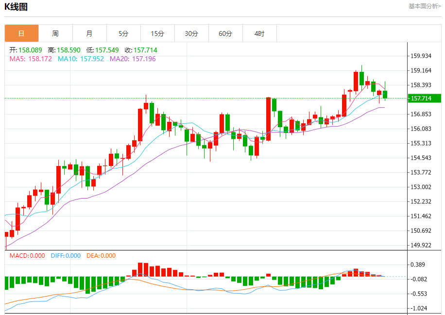 汇价高见158.590,低见157.548。上一交易日,汇价收于158.093。