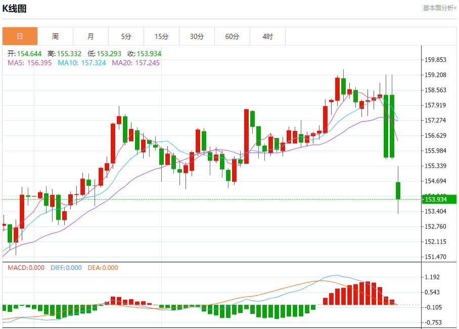 汇价高见155.332,低见153.293。上一交易日,汇价收于155.662。