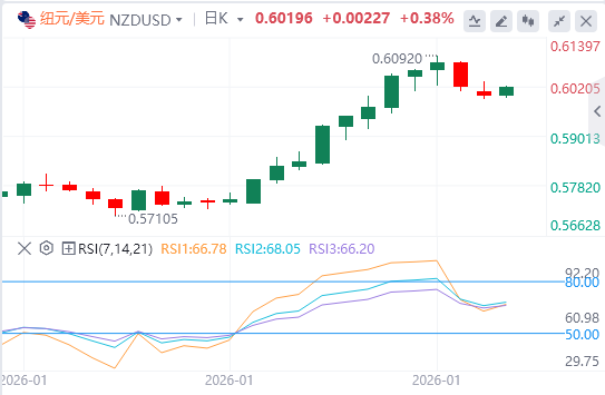 0.60已成为关键的短期支撑,跌破则可通往200日均线0.5850。上行方面,阻力位位于近期高点0.6045,若持续突破该水平,涨幅有望延伸至0.61关口。相对强弱指数(RSI)已从76附近的超买状态回落,目前处于60多中段,暗示仍有进一步上涨空间,但不会被过度拉伸。