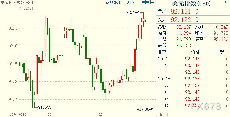 现货黄金下跌0.04%至1738.29美元/盎司;COMEX期金主力合约下跌0.04%至1739.6美元/盎司;美元指数上涨0.37%至92.142;美债收益率下跌逾4个基点至1.647%