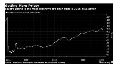 过去一个月,在新兴市场出现大规模资金外流的情况下,埃及镑表现强劲。埃及镑是继缅甸货币之后今年全球最坚挺的货币,兑美元汇率上涨了2.1%。但它显然正变得越来越被高估,这意味着下跌可能只是时间问题。摩根士丹利分析师Jaiparan Khurana和James Lord在3月17日表示,投资者应减少对埃及镑债券的敞口,因为埃及镑不再便宜,特别是考虑到埃及央行自7月以来已降息650个基点。